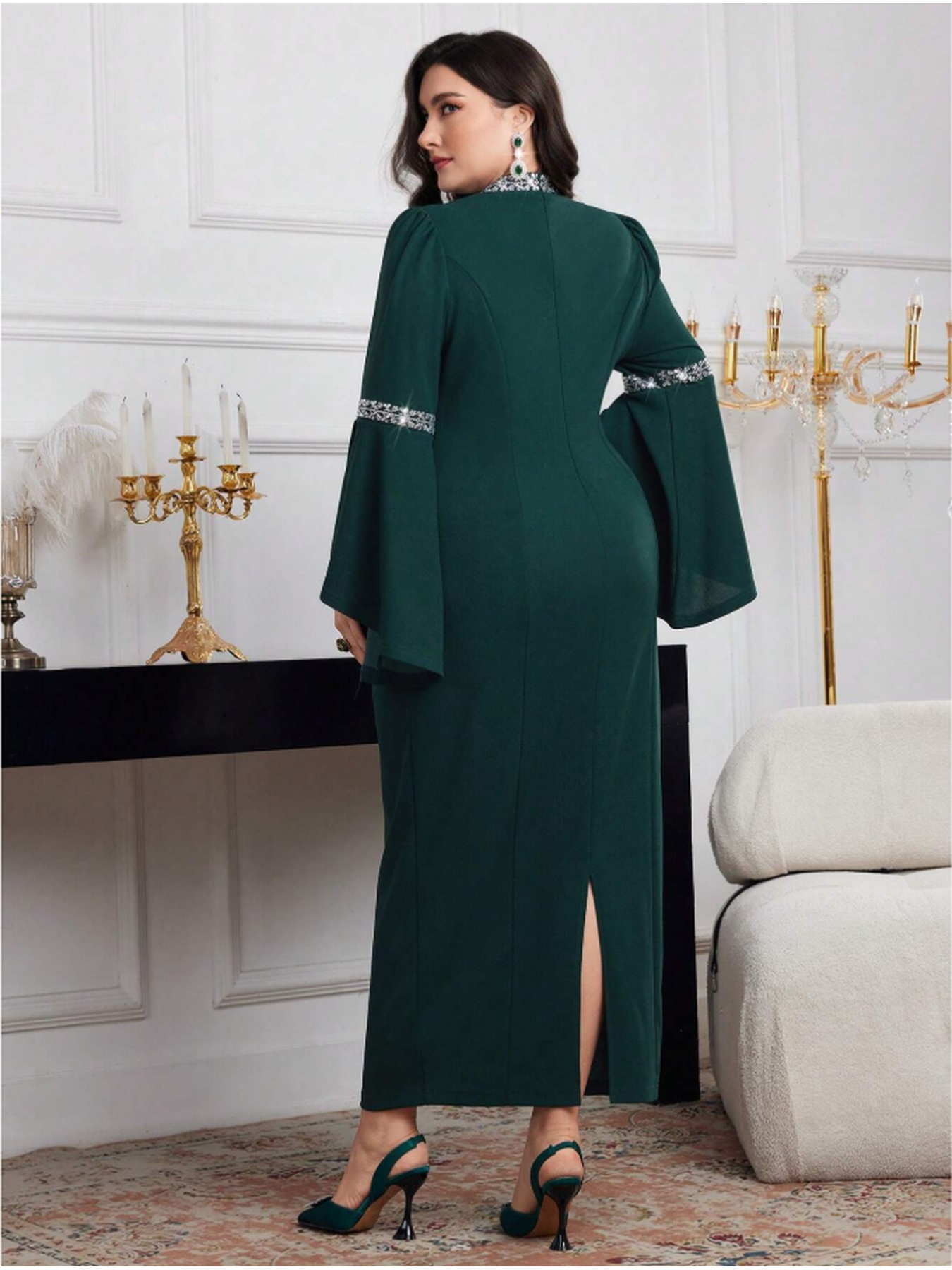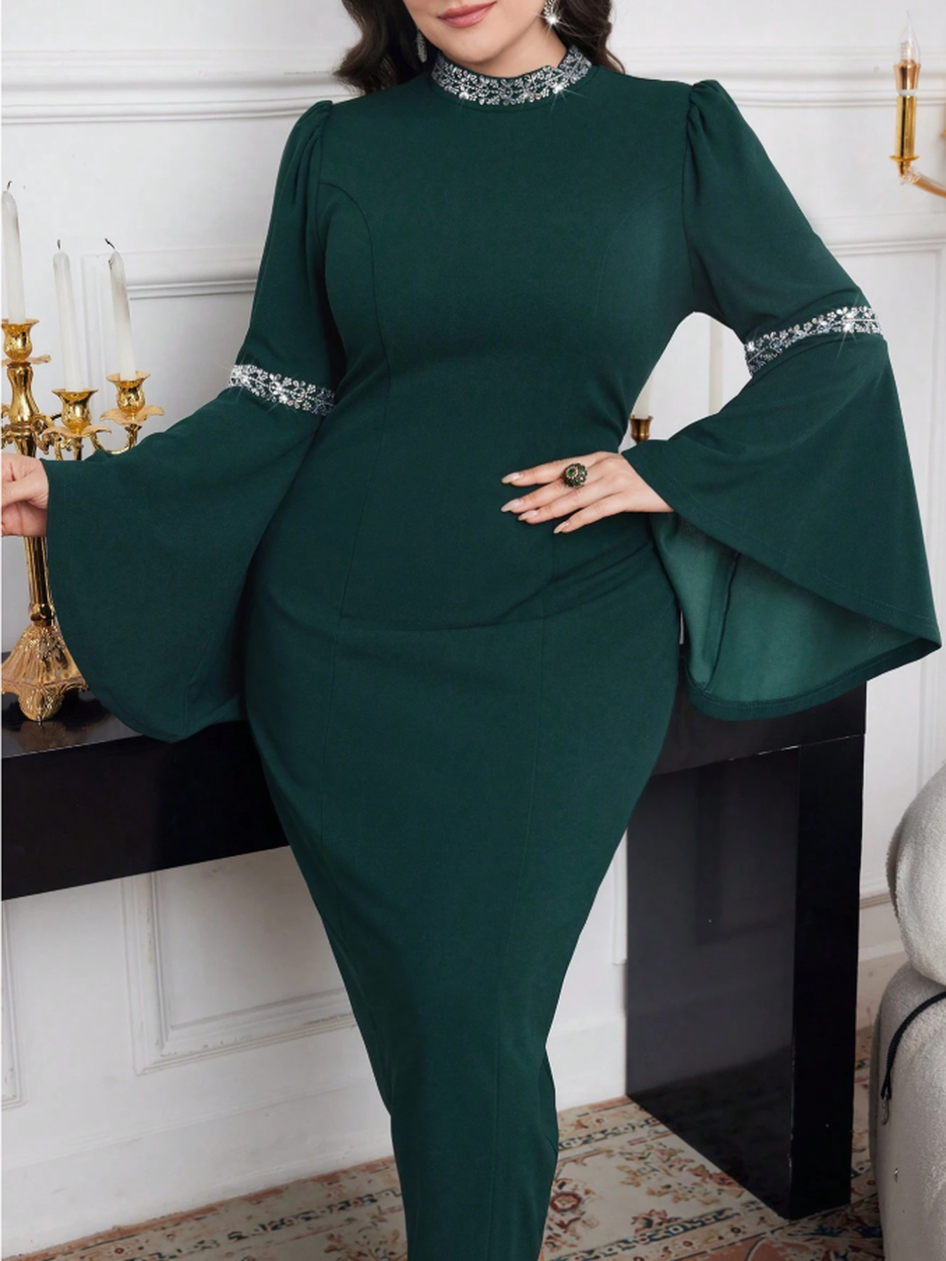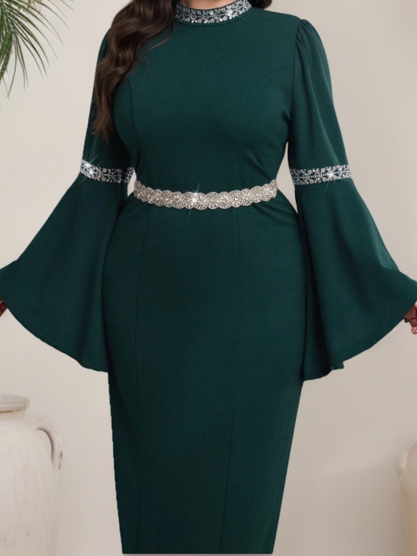 [Plus Size Bell Sleeve Dress] Elegant Plus Size Bell Sleeve Dress - Stretchy & Form-Fitting, Solid Color, Crew Neck, Perfect for Spring/Summer/Fall, Women's Fashion, Sophisticated Style, Elegant Event Attire