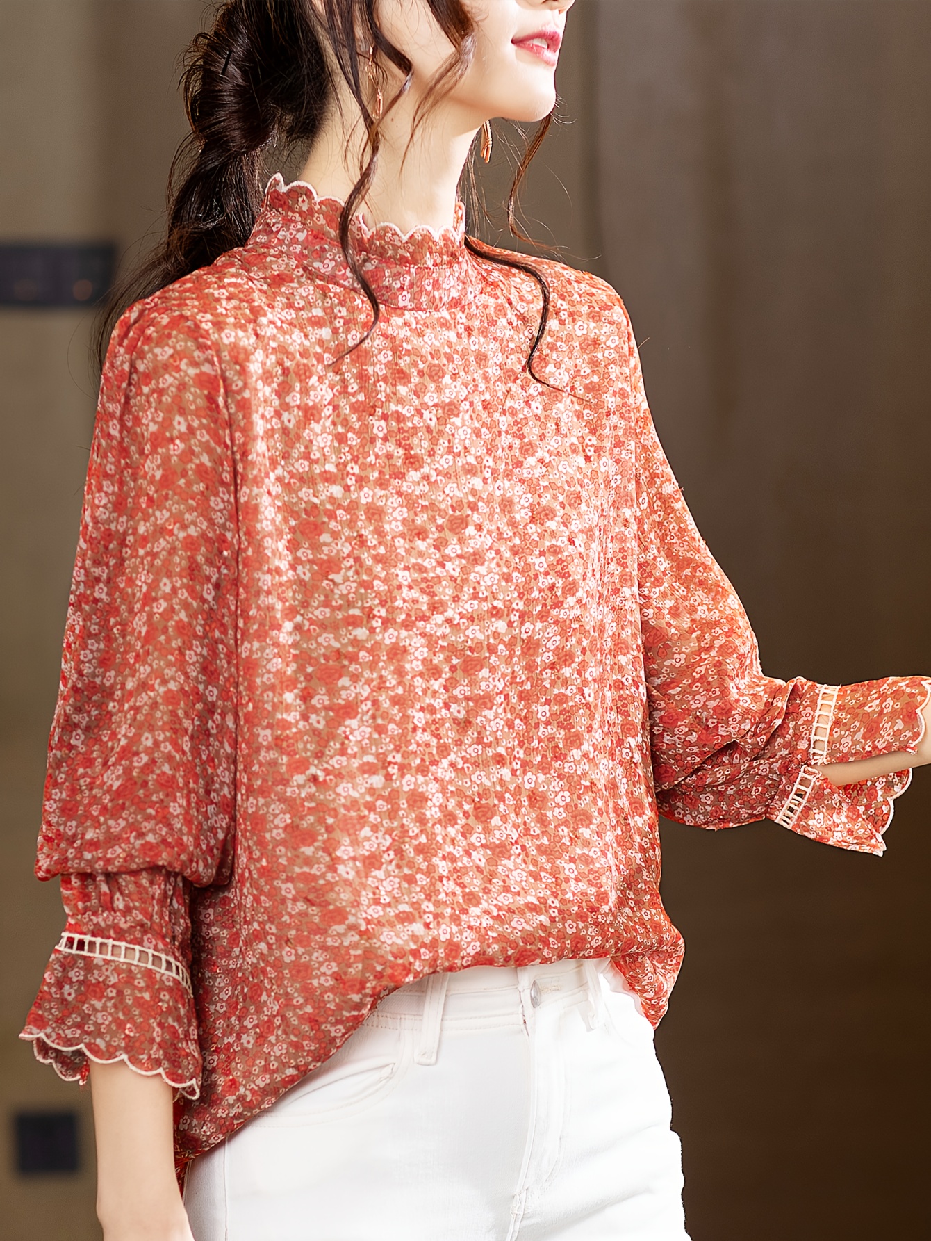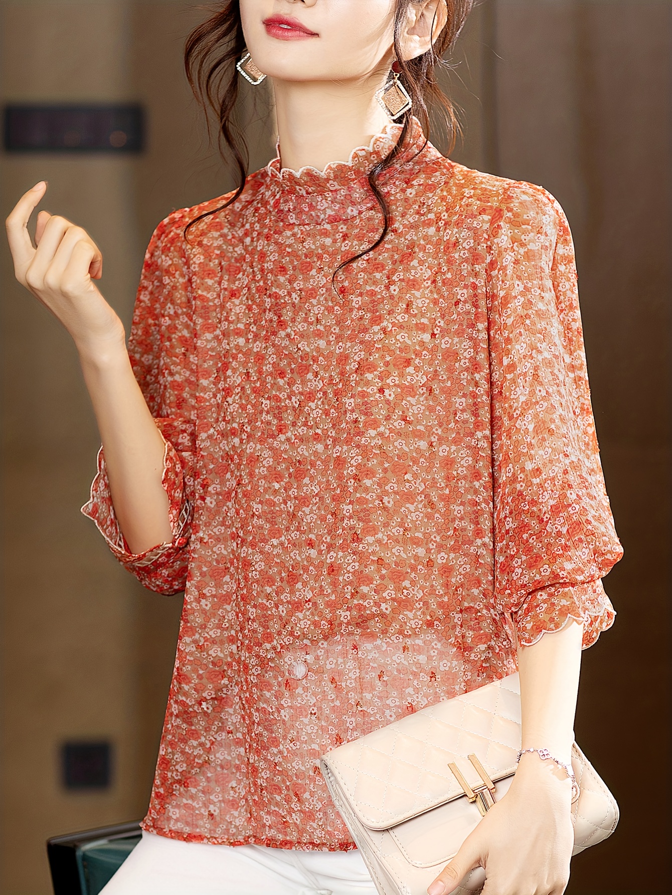 Plus Size - Elegant Floral Print Chiffon Blouse with Ruffle Detail - Long Sleeve, High Neck, Lightweight & Versatile for Spring/Fall, Perfect for Casual or Formal Occasions, Ladies Blouses