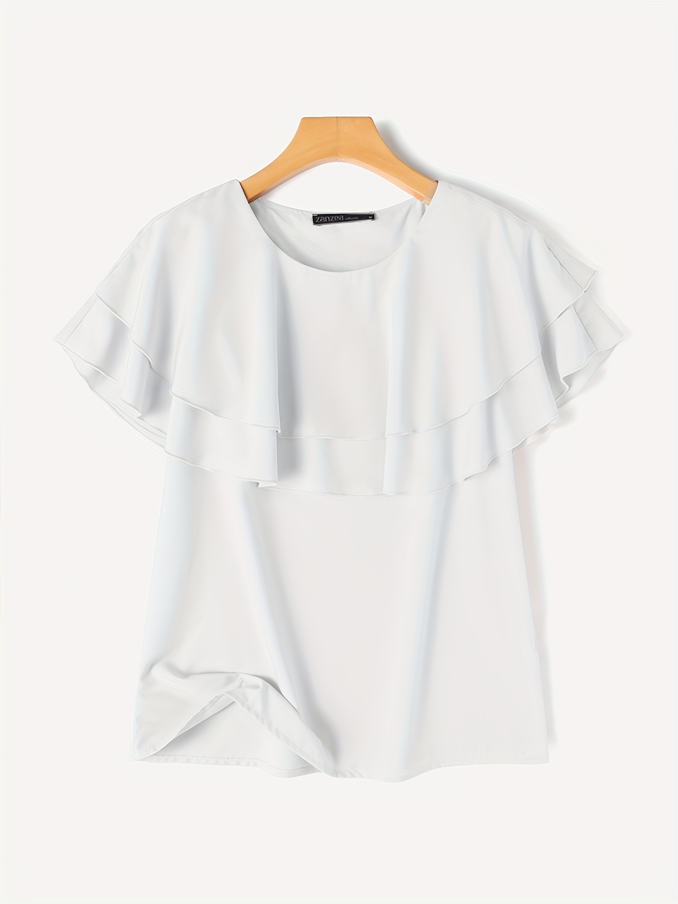 [Short Sleeve Ruffle Blouse] Elegant Plus Size Women's Blouse - Casual Short Sleeve with Ruffle Detail, Solid Color, Non-Stretch Polyester - Perfect for Spring/Summer