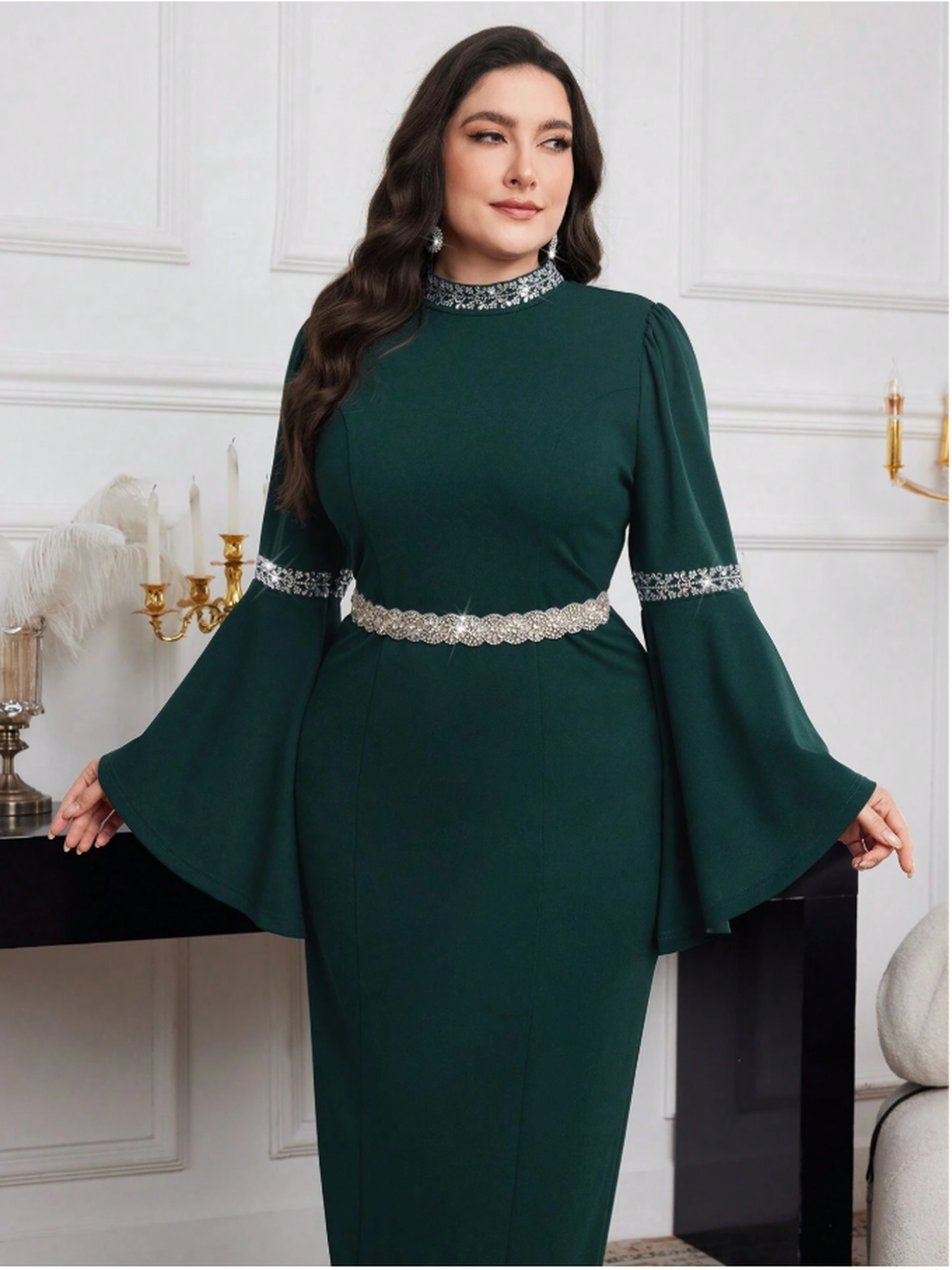 [Plus Size Bell Sleeve Dress] Elegant Plus Size Bell Sleeve Dress - Stretchy & Form-Fitting, Solid Color, Crew Neck, Perfect for Spring/Summer/Fall, Women's Fashion, Sophisticated Style, Elegant Event Attire