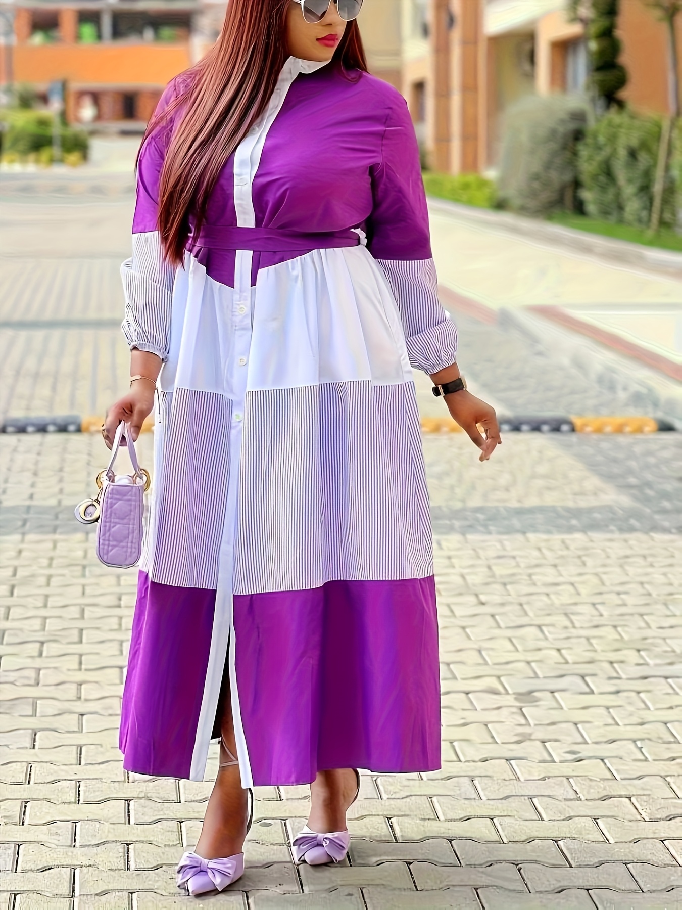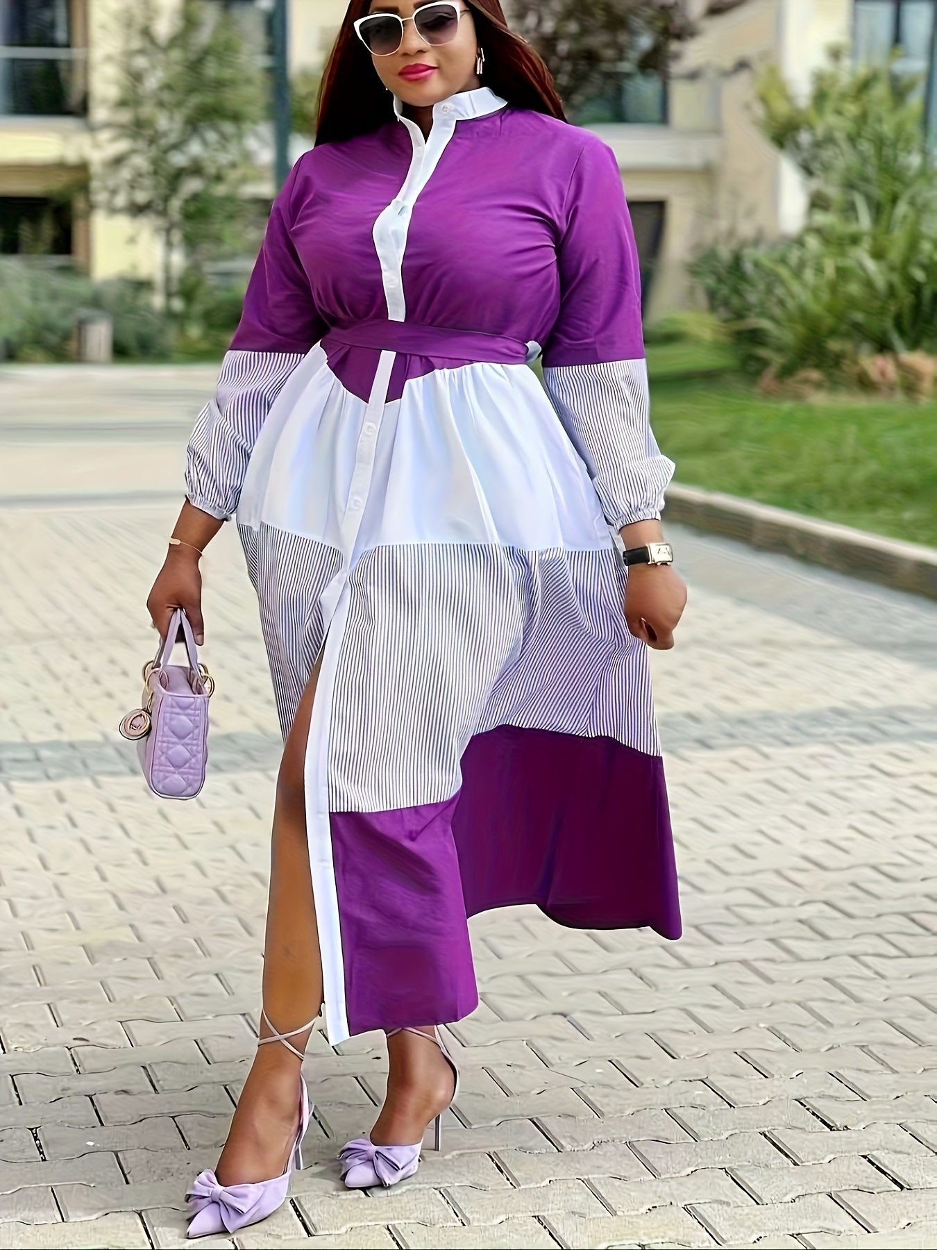Plus Size - Plus Size, Women'S Plus Size Elegant Long Sleeve dress - Formal & Casual office to party Outfit, Button-Front Long Dress in Olive Green & White Vertical Stripes, Non-Stretch Fabric for Everyday & Special Events, Versatile Wardrobe Staple, Classic Round Neckline, Structured Silhouette, Stylish Blouse Dress, Professional Women