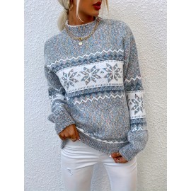 Plus Size, Women's Plus Size Winter Sweater Sweater Vest-like Long Sleeve Tunic - Soft Stretchy Turtleneck Sweater Coat with Snowflake & Print (Blue/White/Pink/Brown) - Cozy Christmas Party & Casual Outfits for Cold Weather - Plus