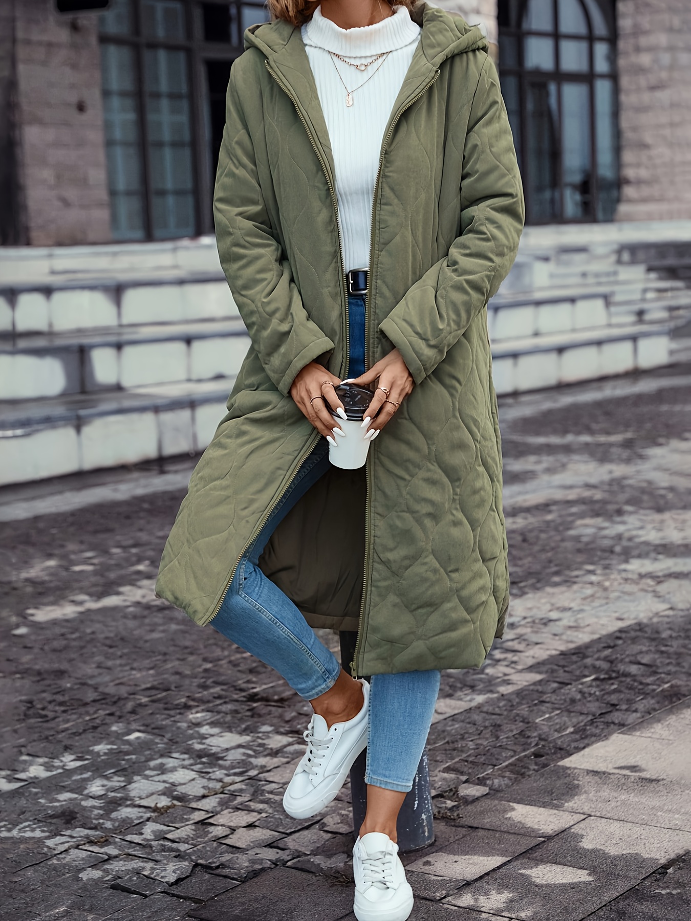 Plus Size - Women'S Elegant Quilted Hooded Coat with Slant Pockets - Warm & Comfortable Long Sleeve Outerwear, Olive Green, Button-Up Front, All-Season Wear, Casual Style, Casual Winter Wear | Quilted Design | Buttonup Coat