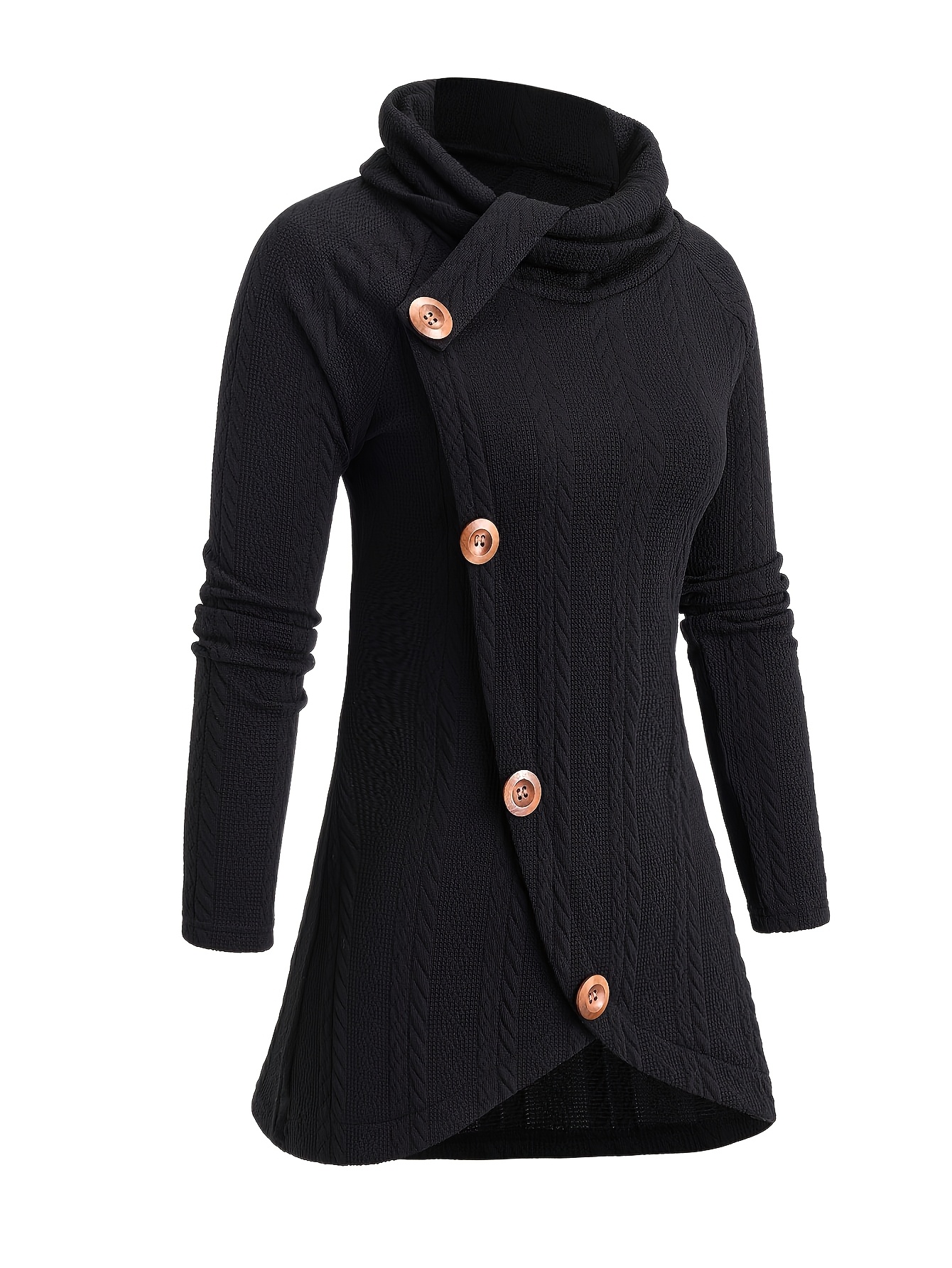Plus Size, Plus Size Women's High Neck Asymmetrical Button-Front Long Sleeve Top - Stretch Fabric, Machine Washable, Solid Black Casual Chic Fall Winter Tops, Seasonal Wardrobe Staple, Stylish Knitwear, Quality Stitching, Button Front Blouse, Stylish Wardrobe Essential