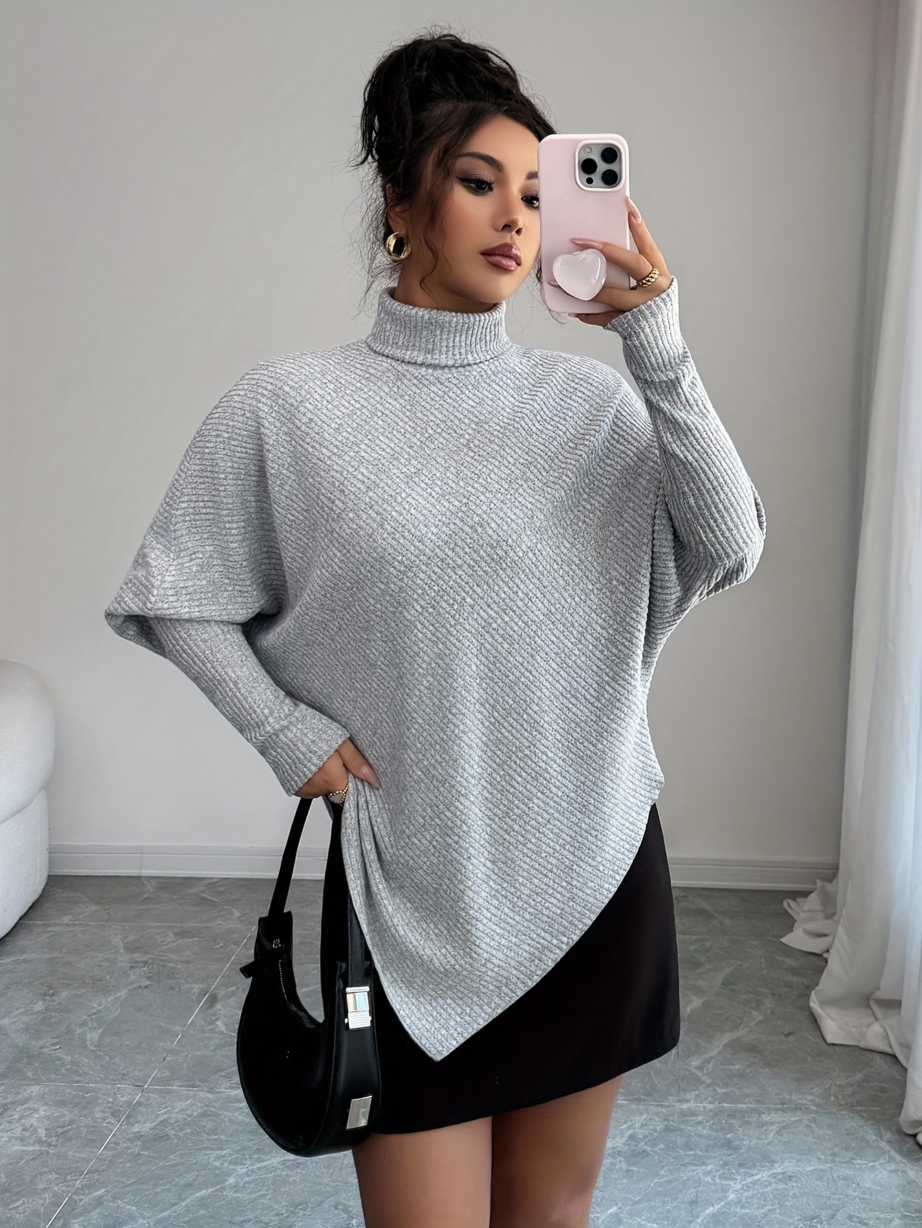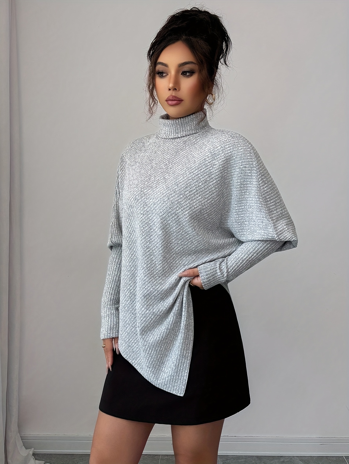 Plus Size, Plus Size Women's Oversized Winter Sweater - Elegant High Neck Batwing Sleeve Pullover, Soft Grey Tunic Top, Cozy Long Sleeve Blouse for Fall & Winter Layering (Machine Washable)