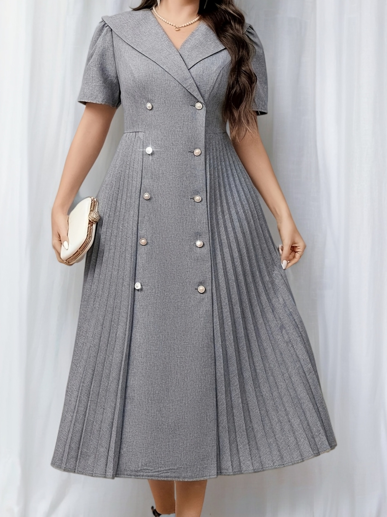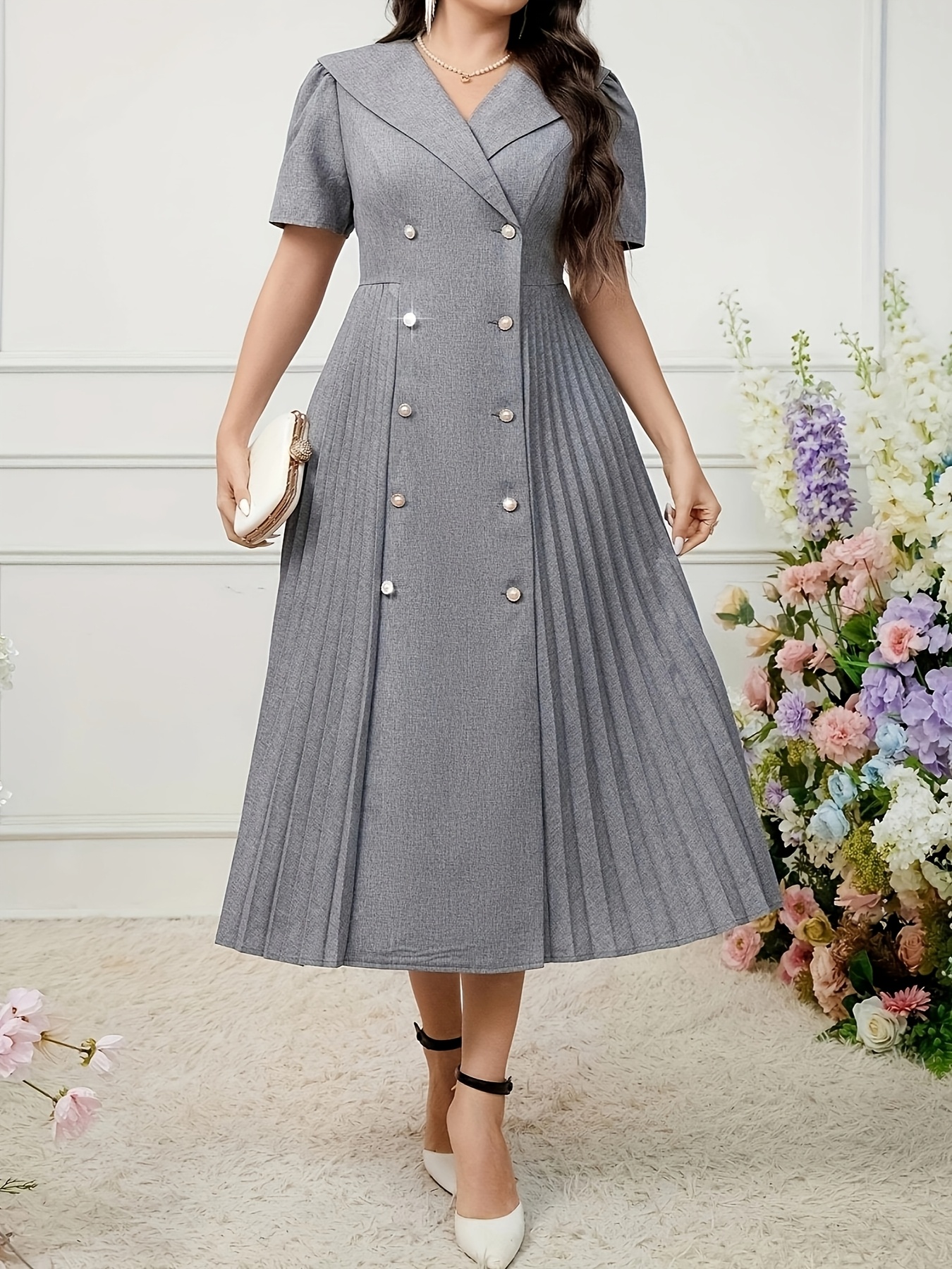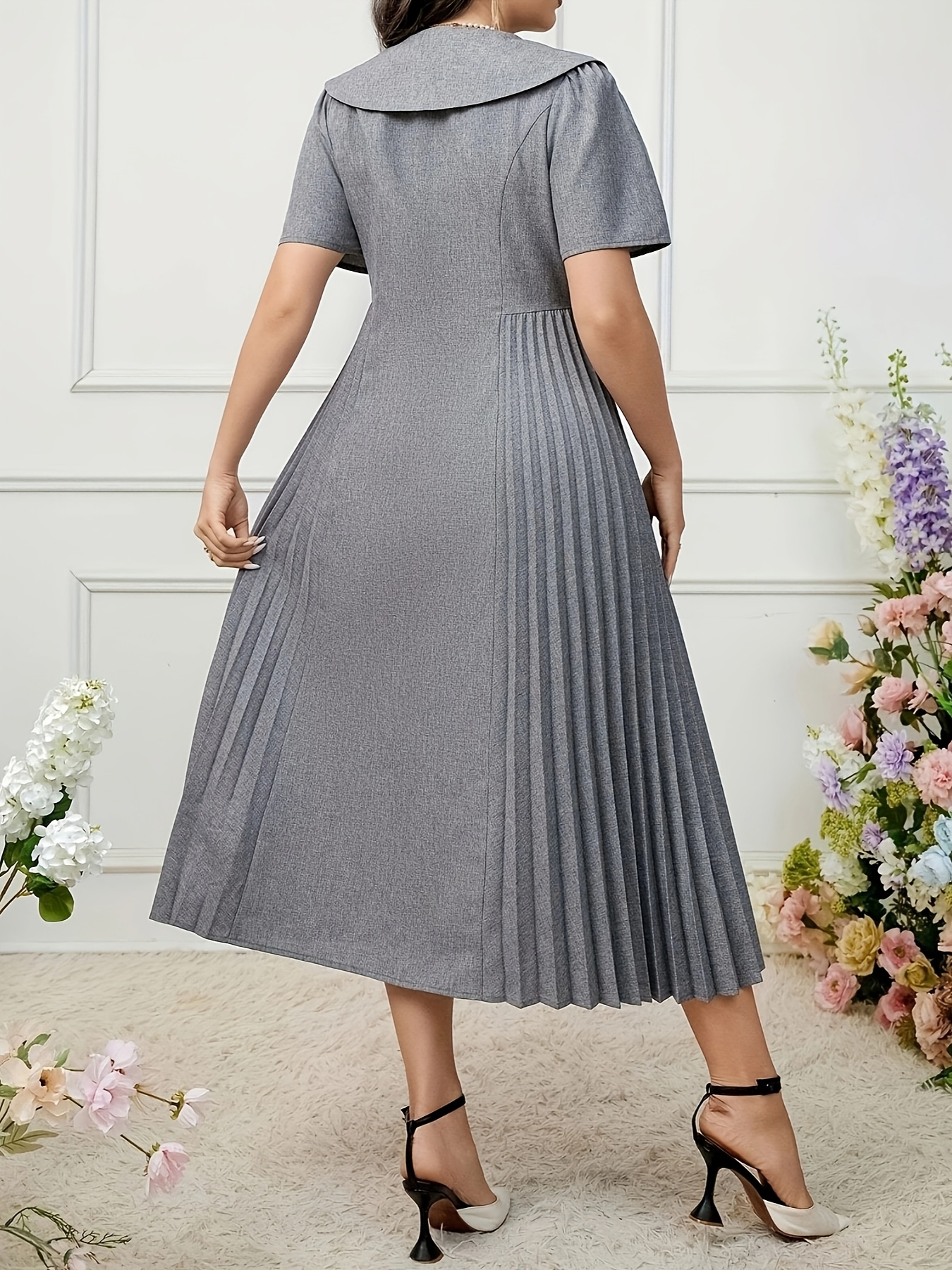 Elegant Pleated Midi Dress, Polyester 95% Spandex 5% Blend, Short Sleeve Tunic with Contrast Lapel Collar, Loose Fit Solid Color, Non-Stretch Fabric, Spring/Summer Casual Weekend Wear