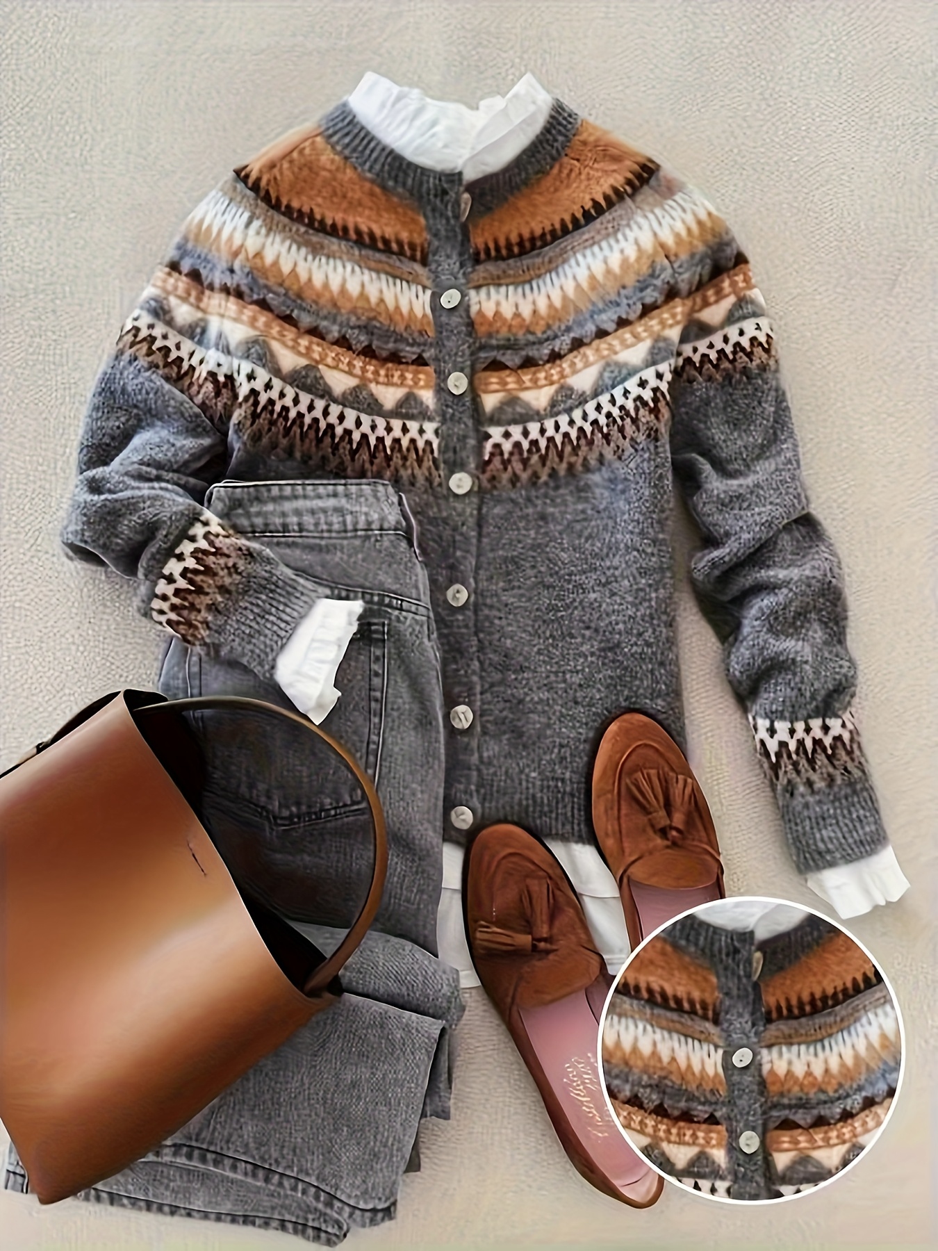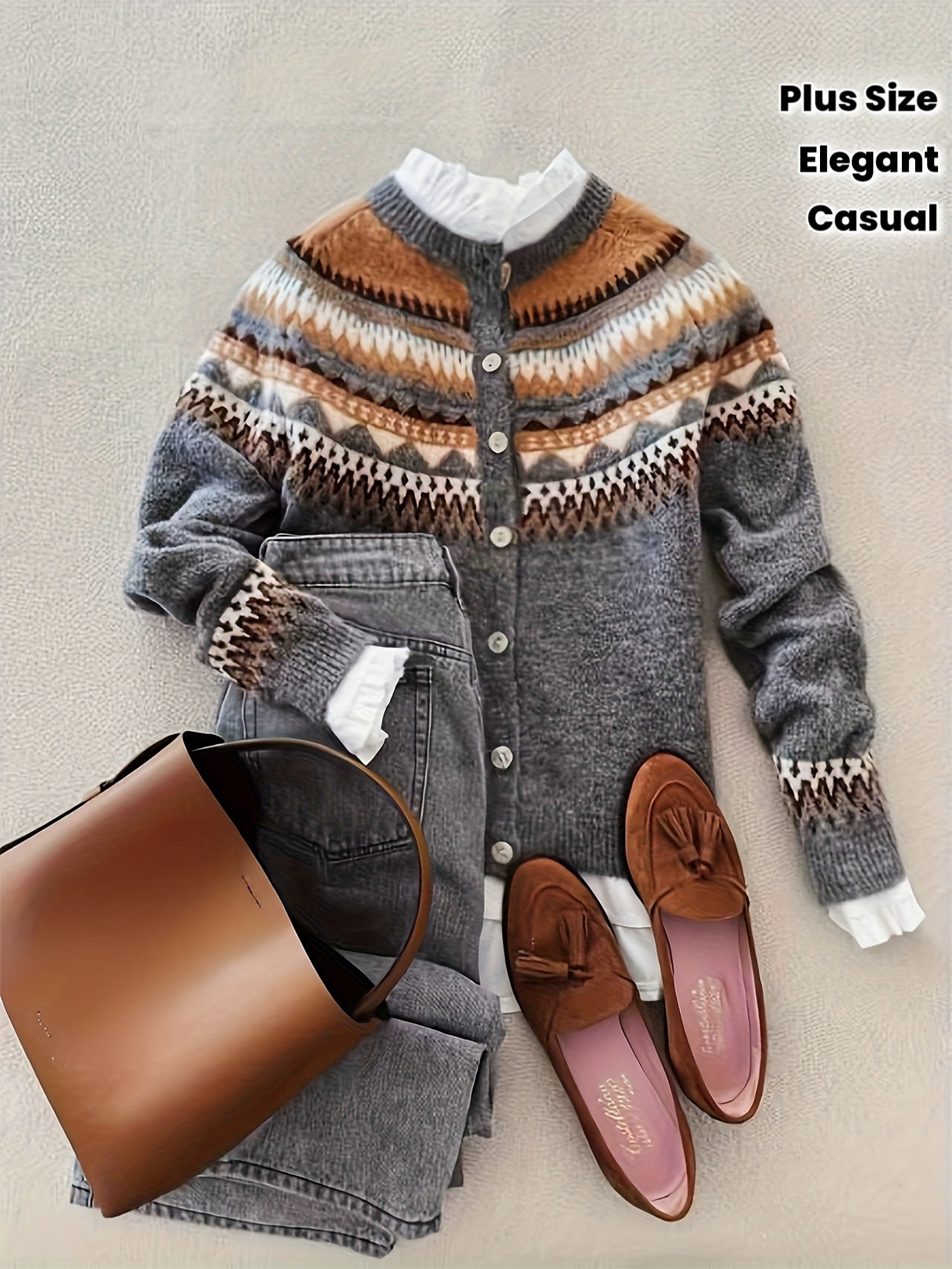 Plus Size - Plus Size Women'S Elegant Sweater - Soft Stretchy Winter Coat with Geometric Pattern, Long Sleeve Round Neck Casual Outerwear, Cozy Fall & Winter Wear, Cozy Winter Wear | Geometric Pattern Sweater | St