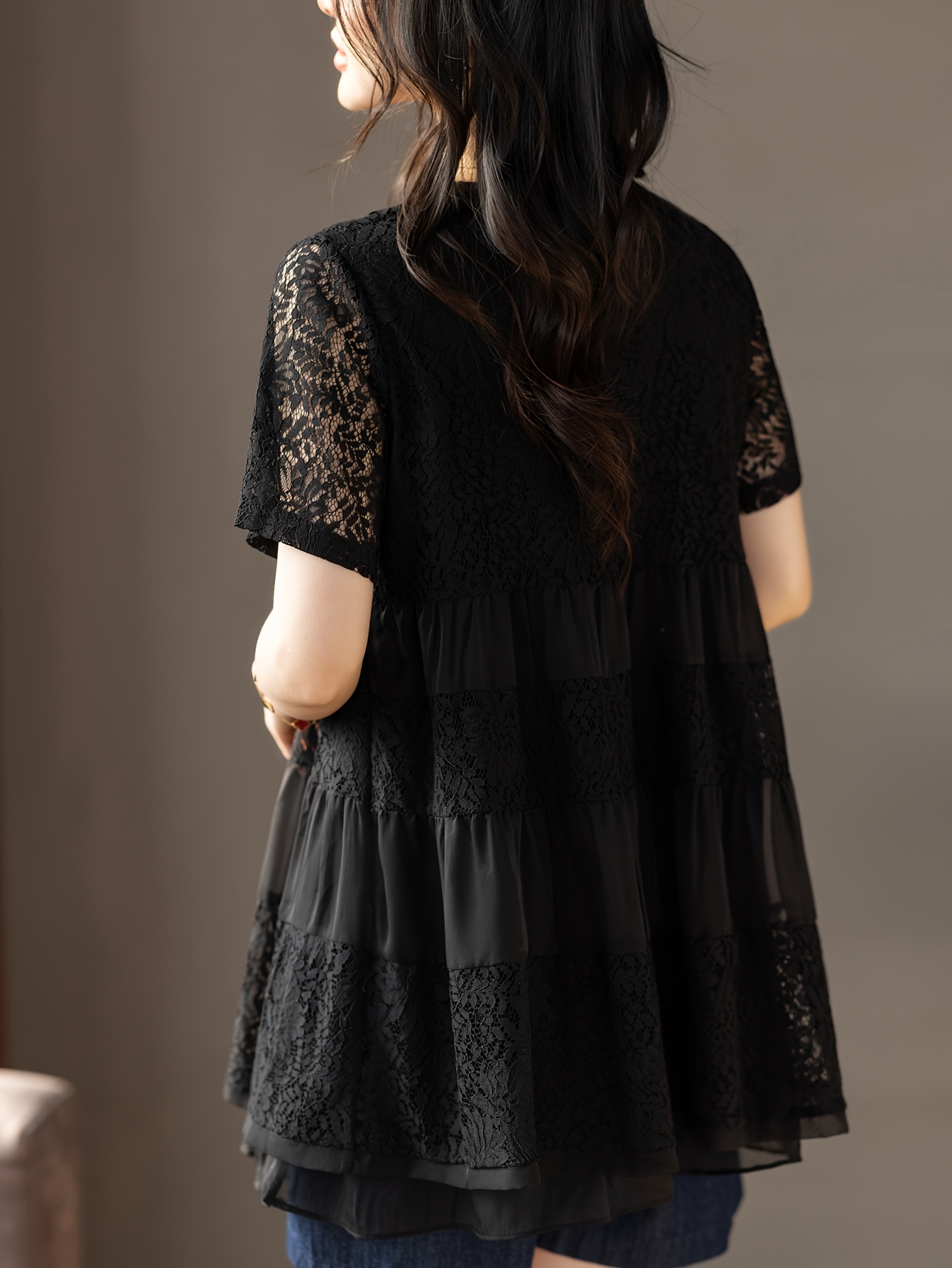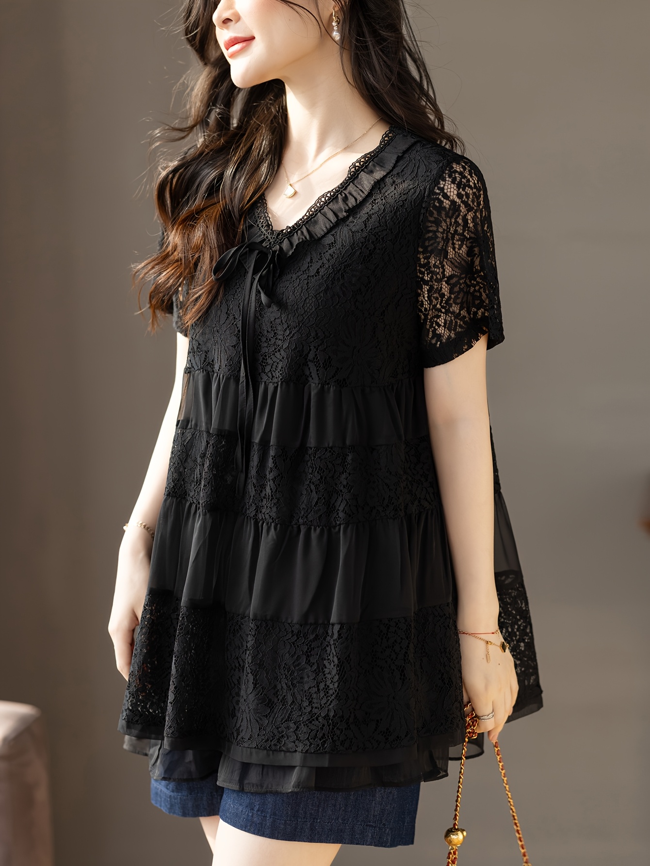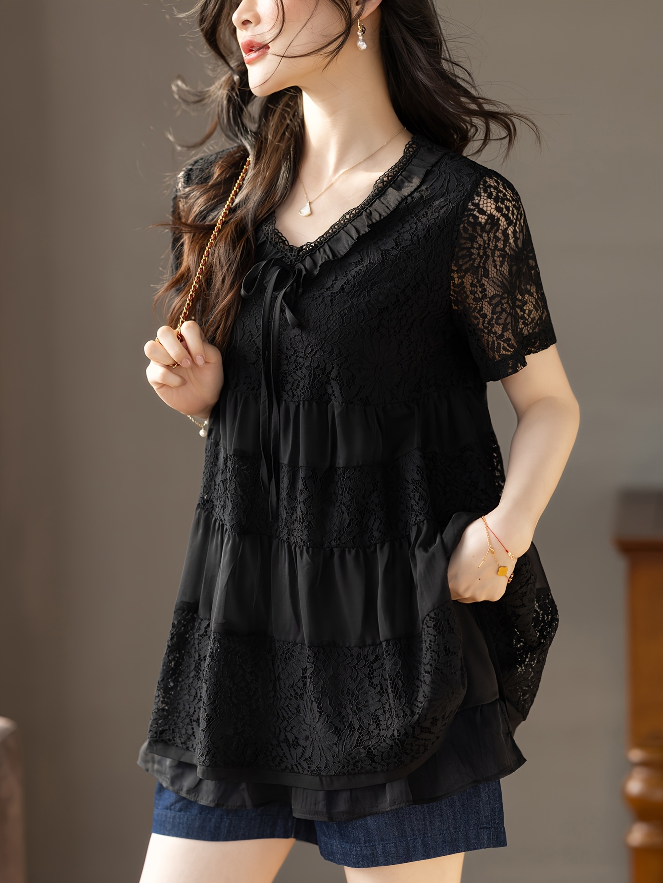 Plus Size - Summer Women'S Lightweight Breathable V-Neck Contrast Lace Blouse - Long Sleeve Longline Top with Ruffled Hem, Elegant Solid Color for Casual & Formal Wear, Versatile Fashion, Sophisticated Detailing